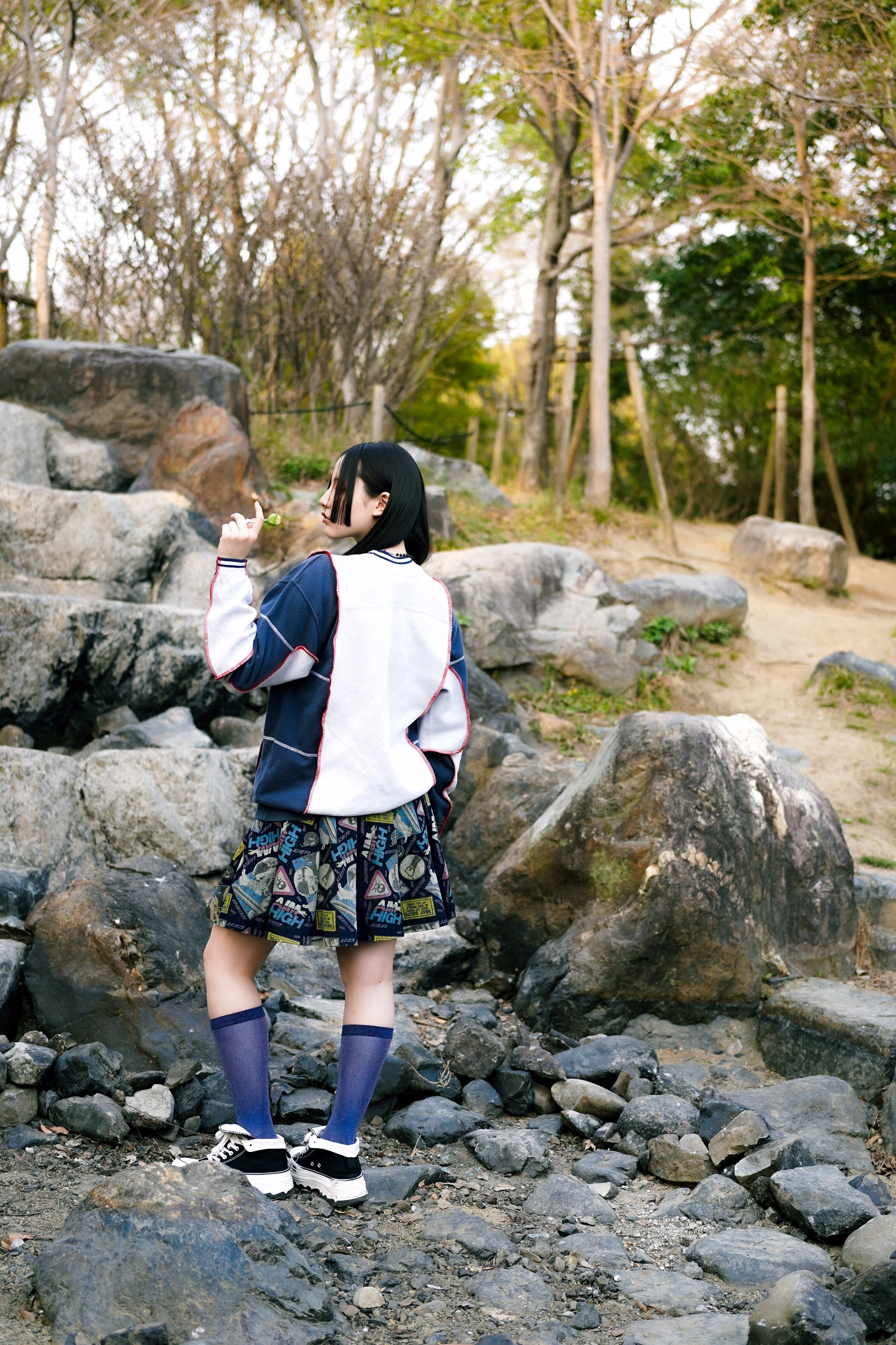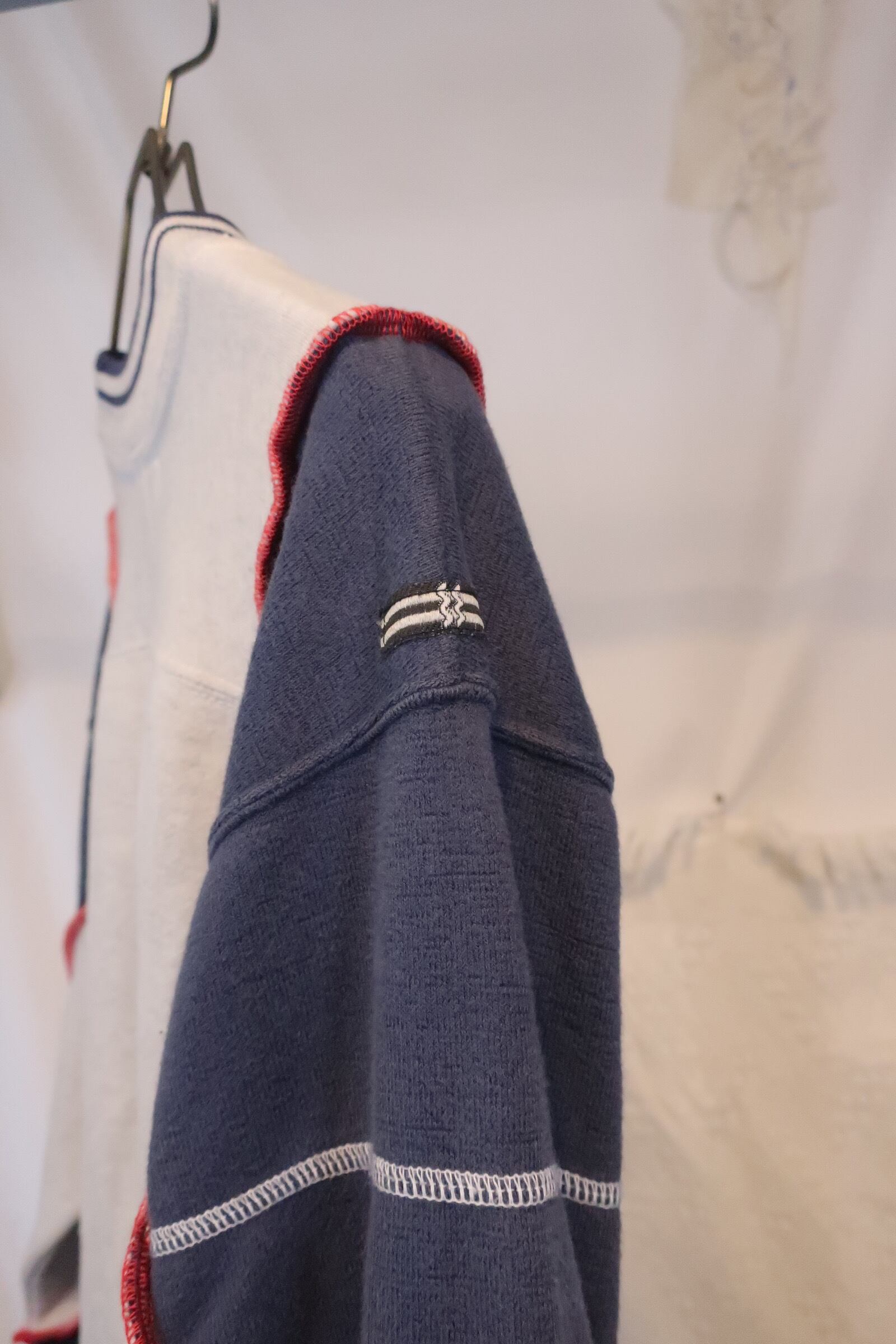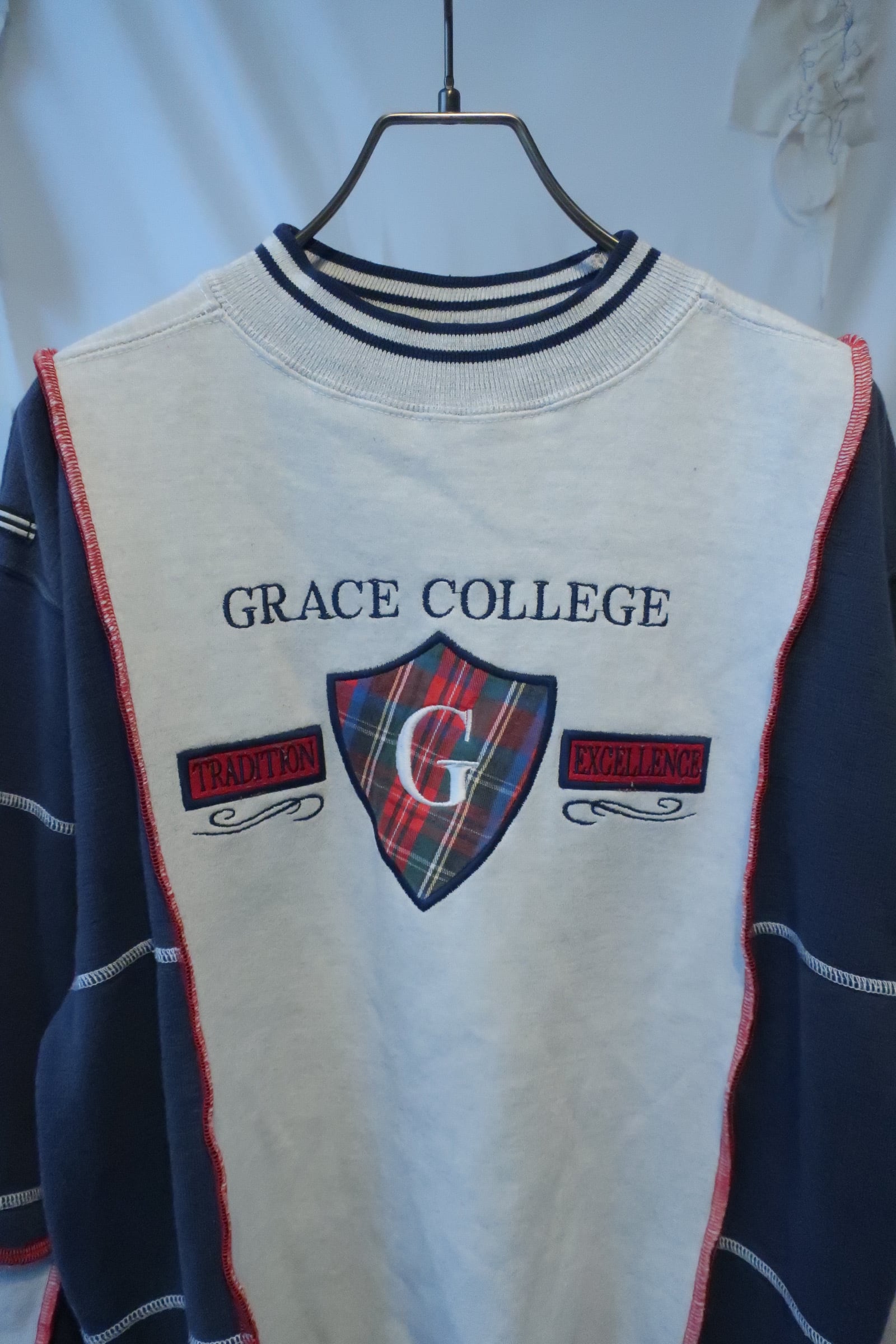 チェック柄がカワイイカレッジロゴスウェットとネイビーに白ステッチのスウェットをパッチワーク風にドッキングしています。