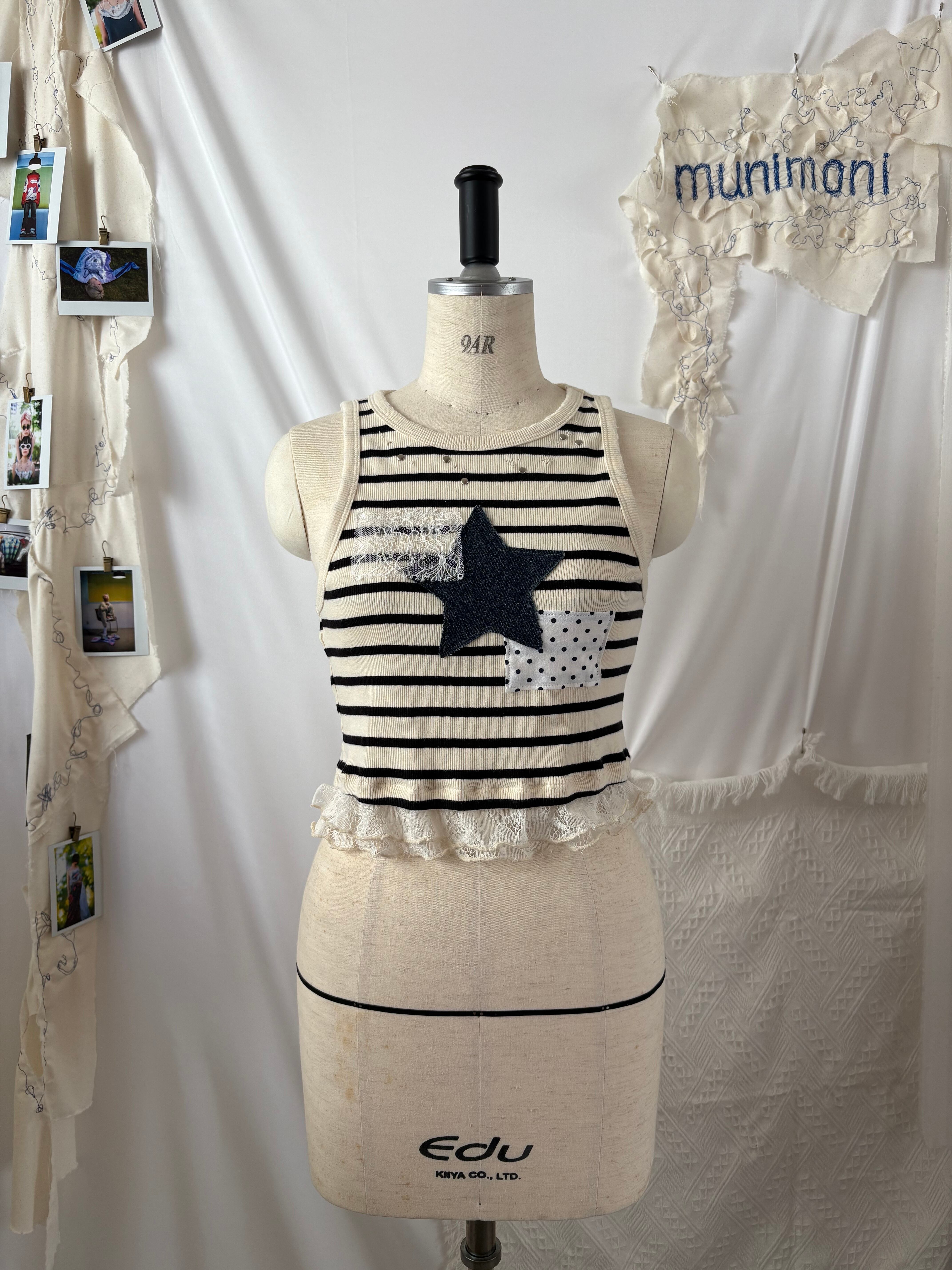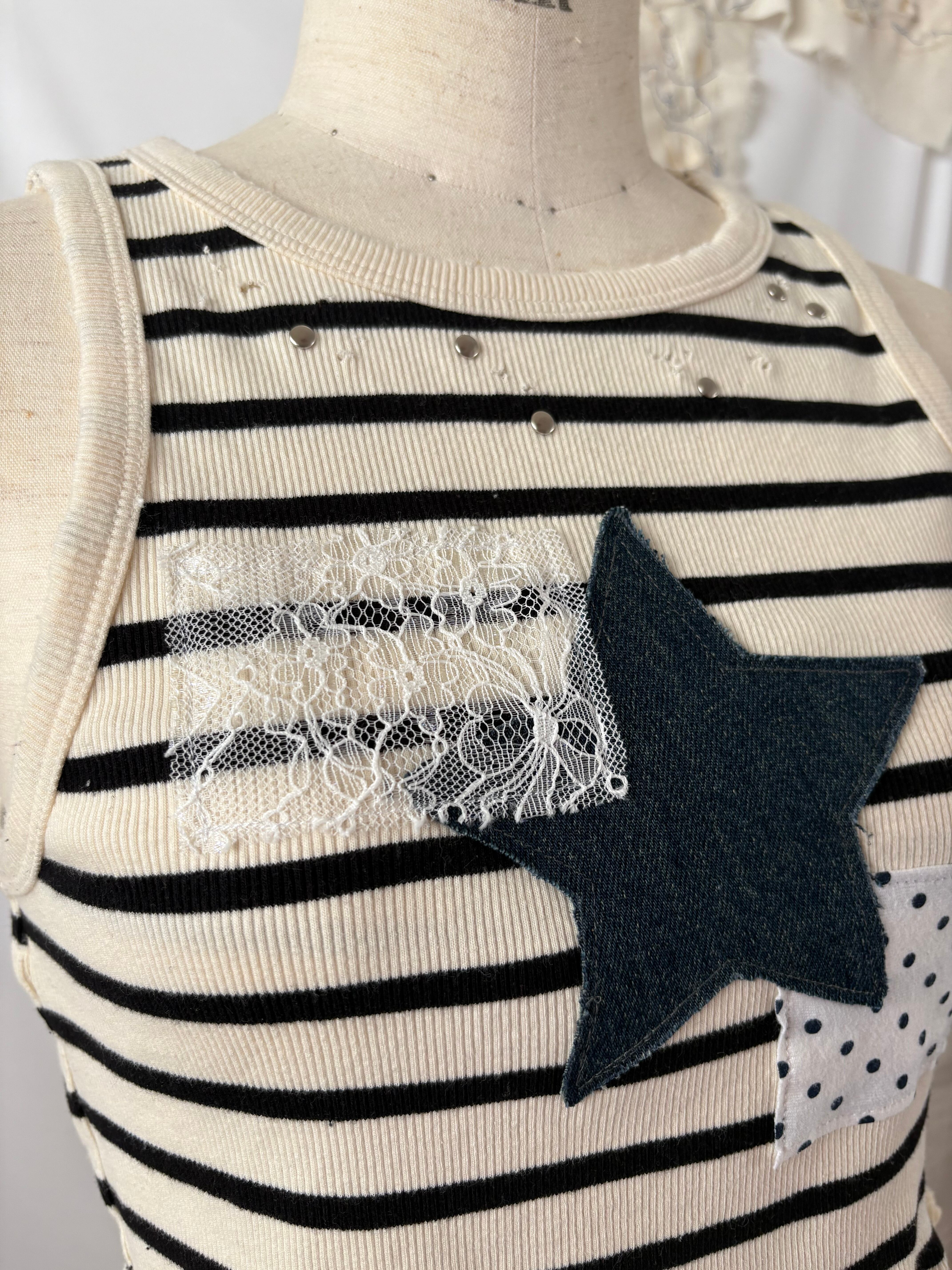 ボーダーのタンクトップにフリルを付け、レースやデニム、Tシャツのはぎれでコラージュしました★ 首周りや袖にはダメージ加工を施しました。 繊細と破壊.⋆.†⋆