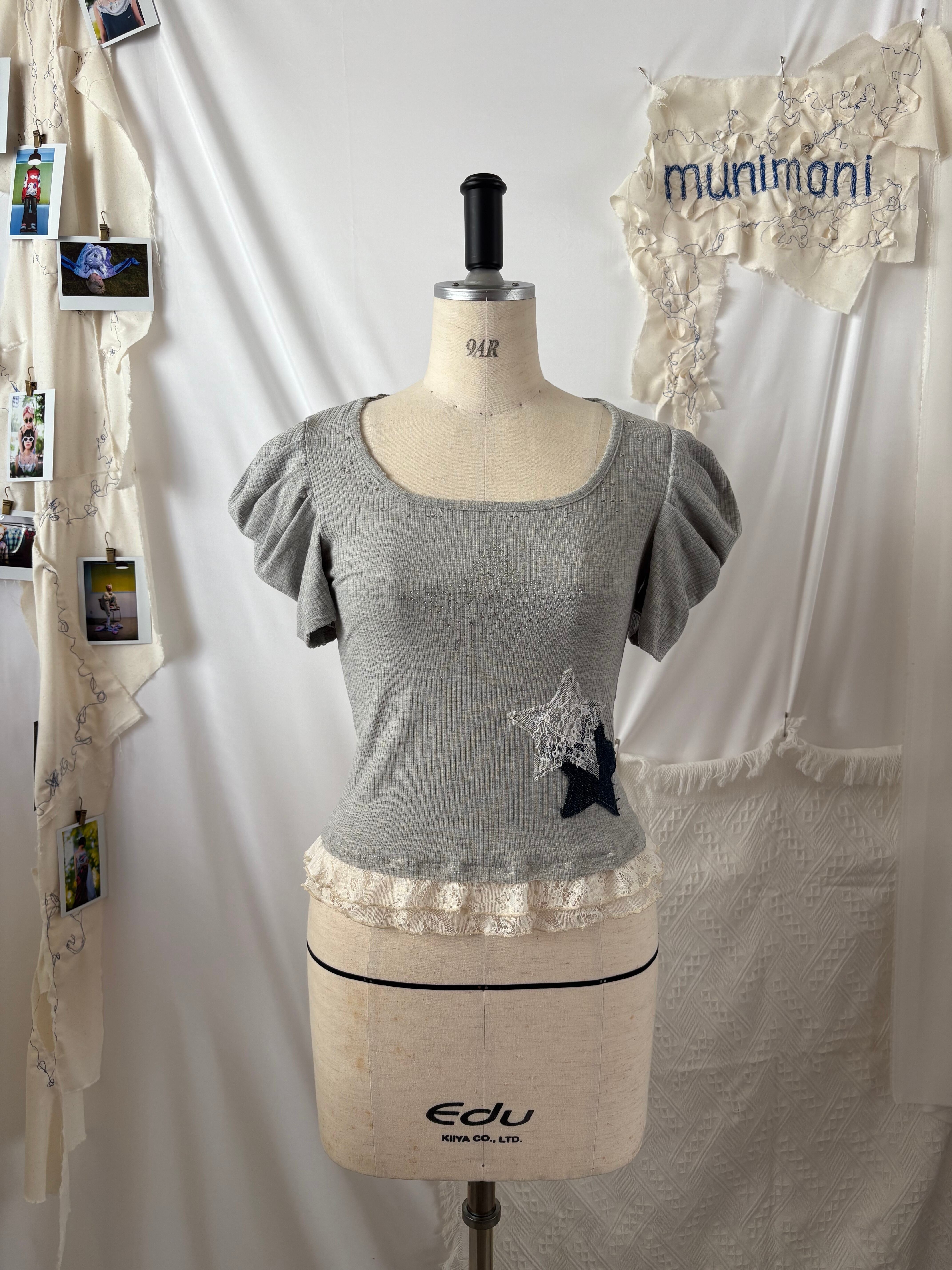 シンプルな半袖のカットソーの丈を調整しフリルを付け、ラインストーンとレースやデニムのはぎれで星のモチーフを★