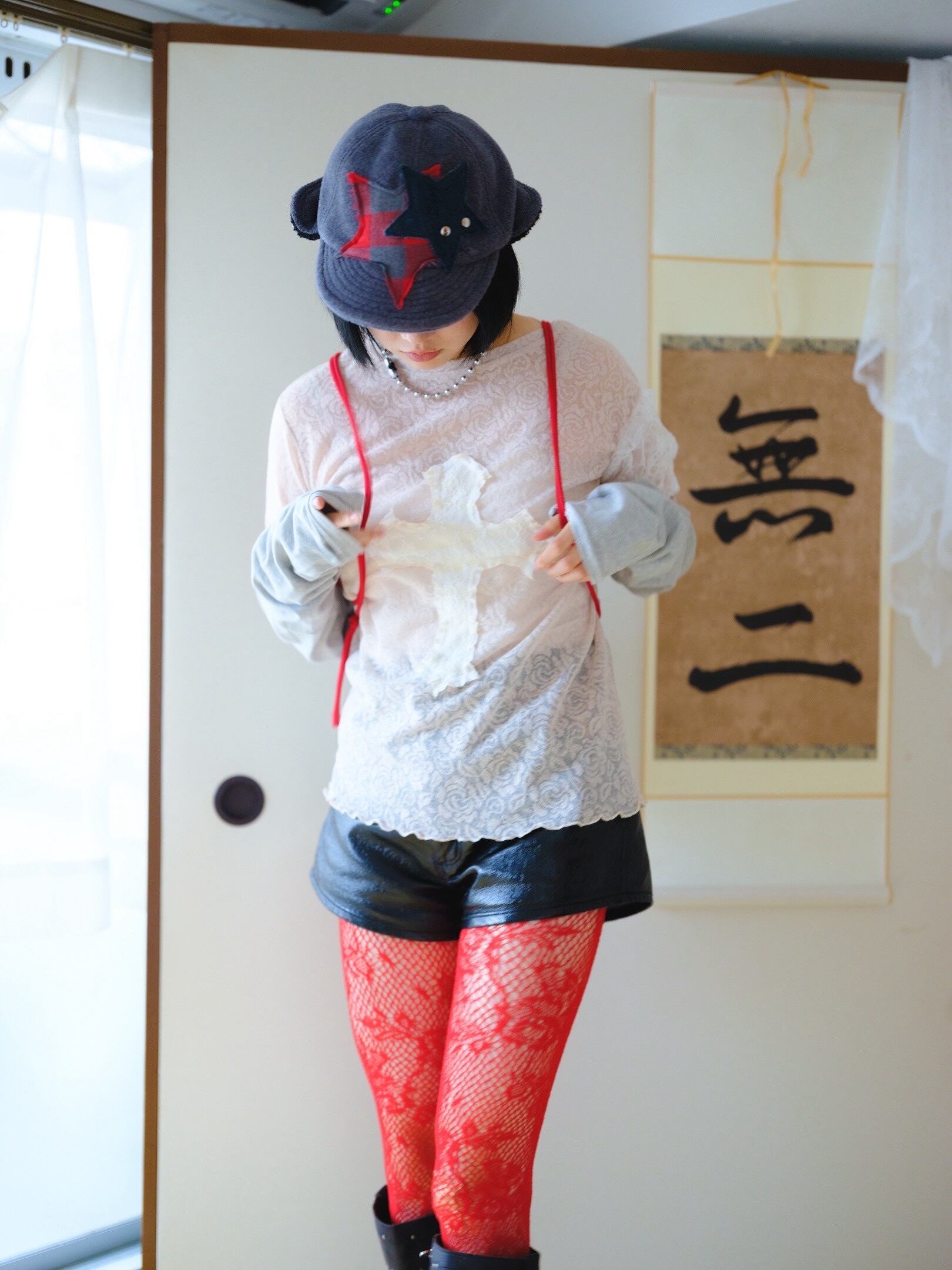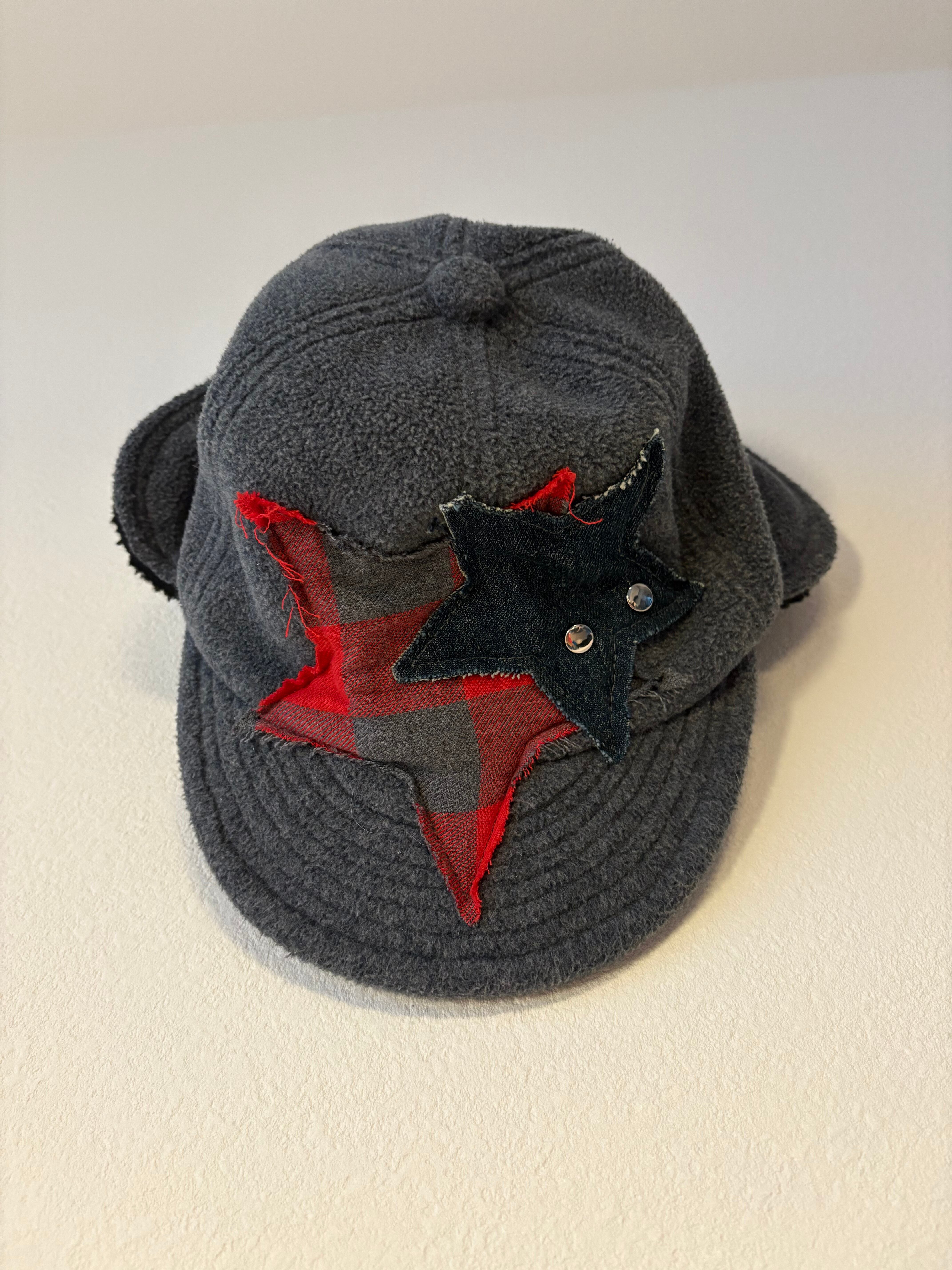 起毛素材の後ろに折り返しのあるキャップに、星のパッチとスタッズを。