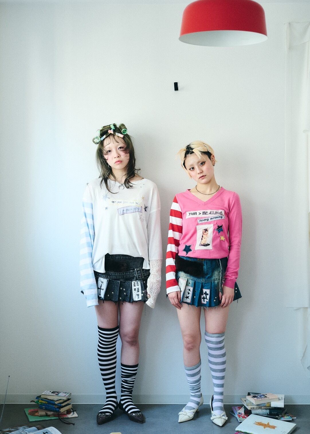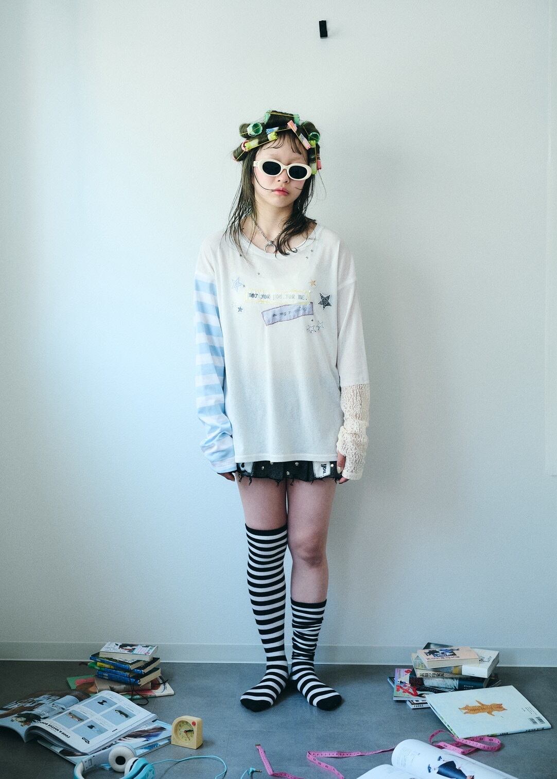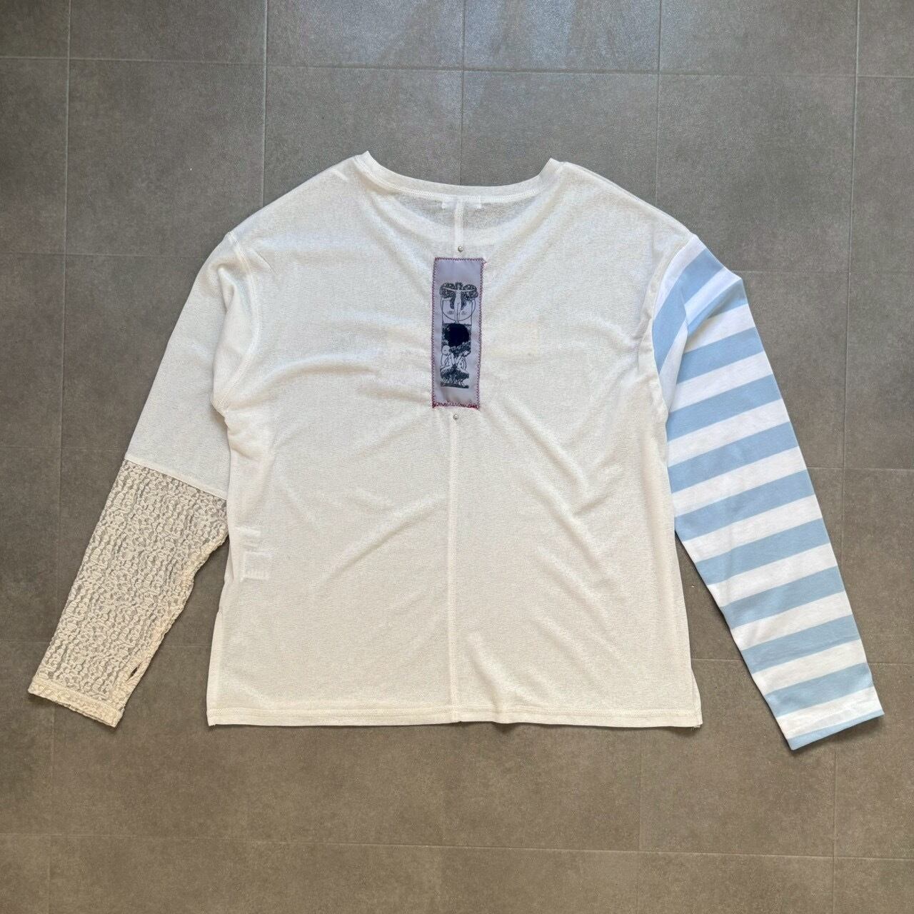 左右の袖にそれぞれボーダーとレースの切り替えを。