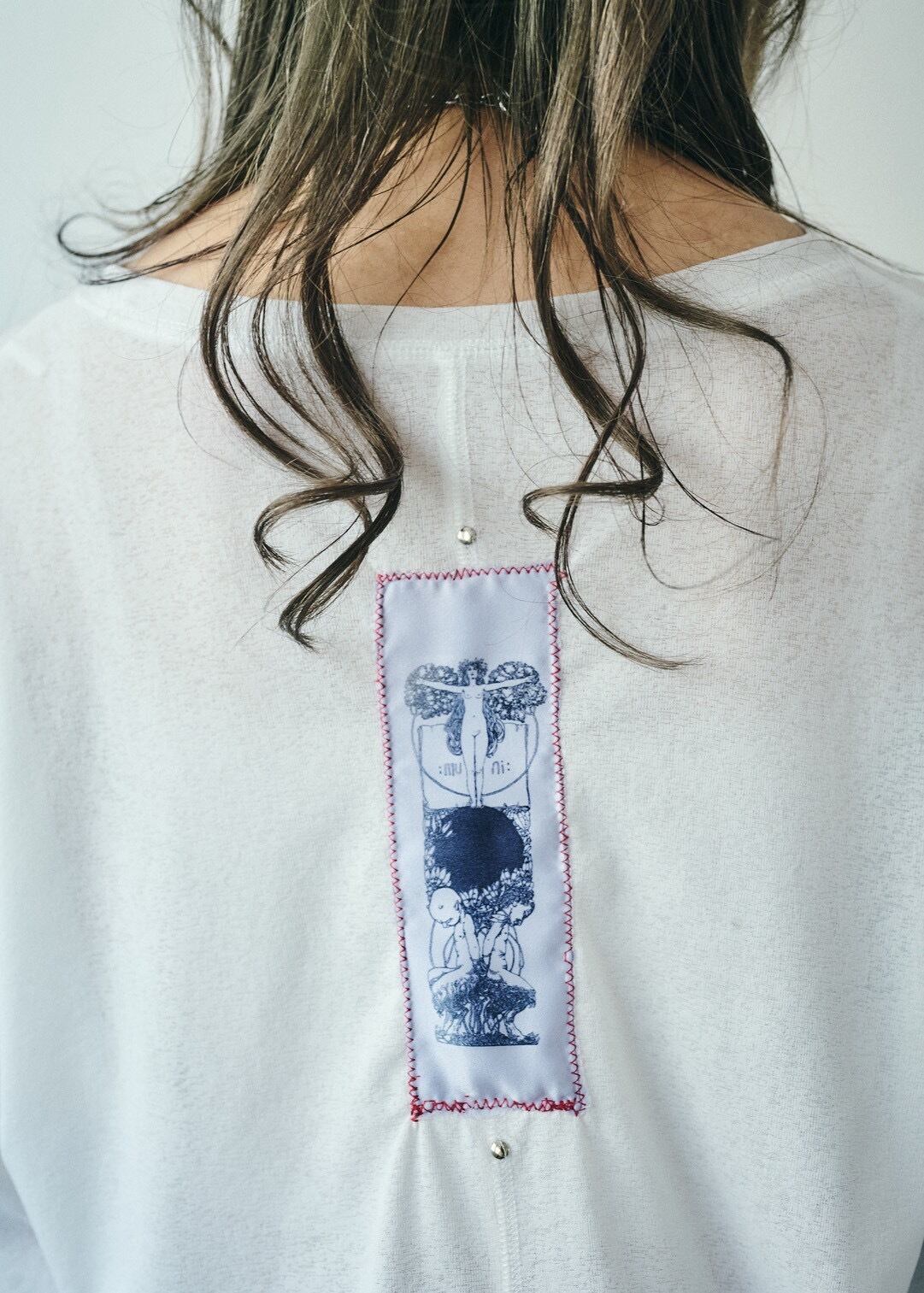 背中は蔵書票のヴィンテージイラストのパッチを。