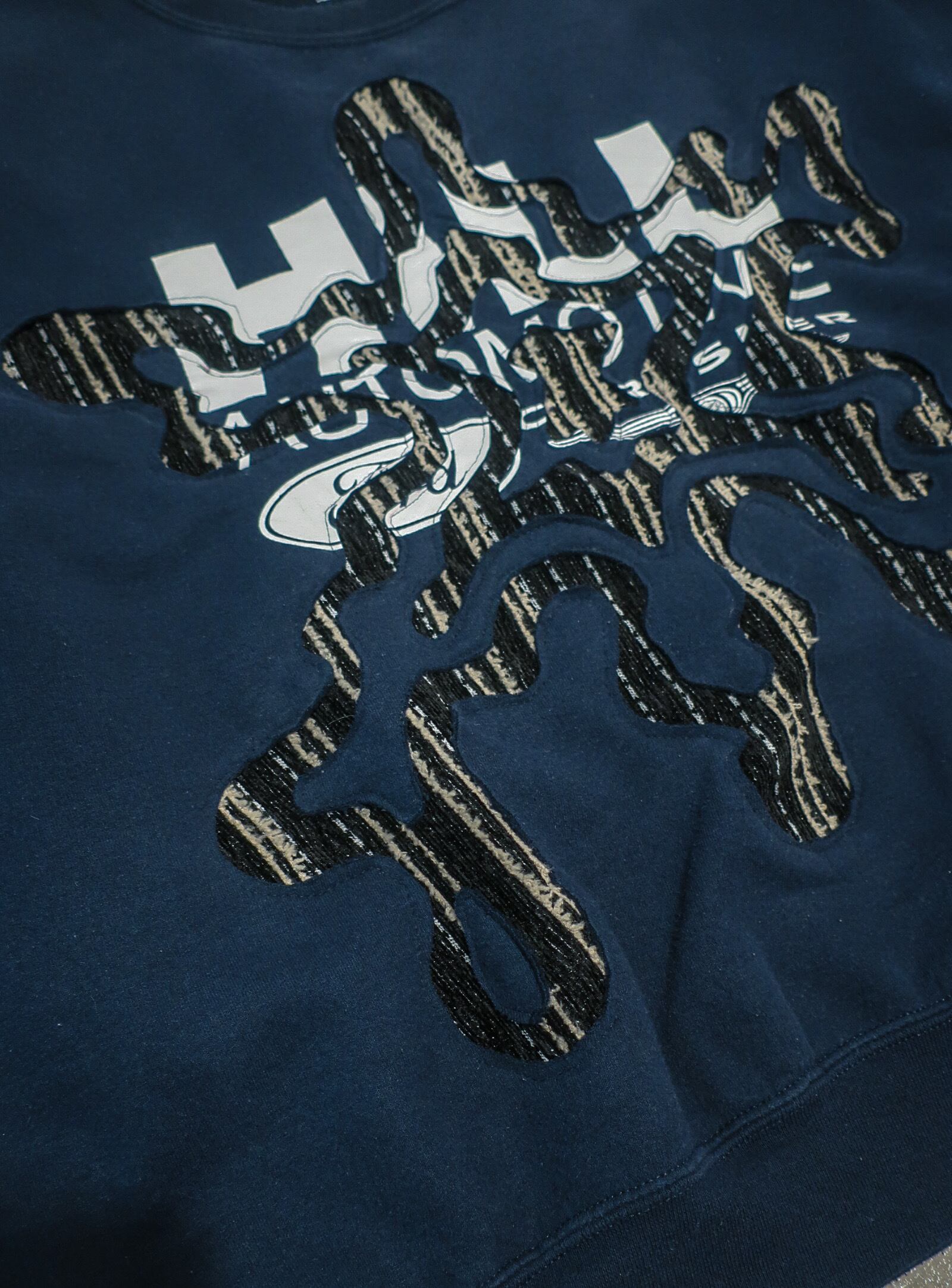 古着のスウェットをくり抜き、裏からジャガード生地を当てて模様を出しています。